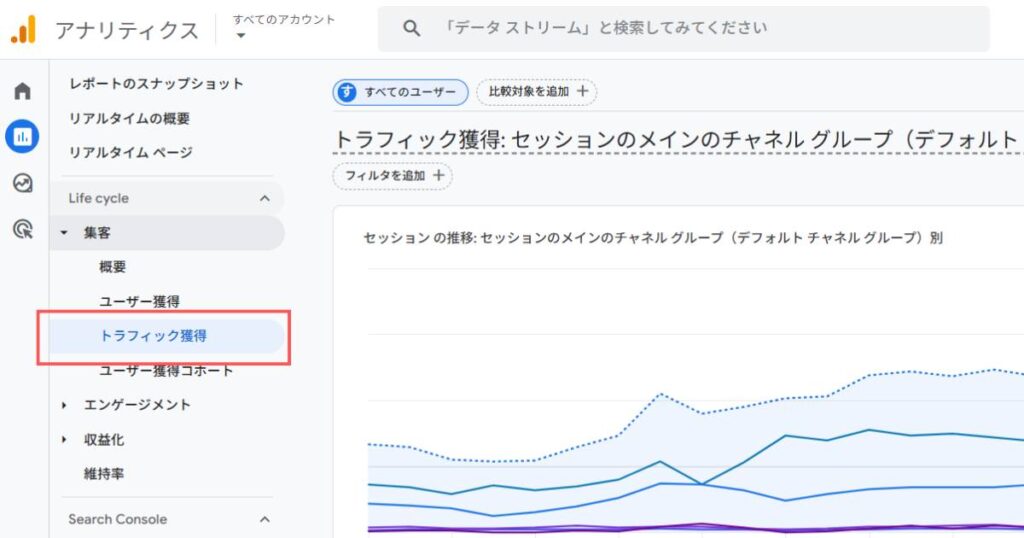 A. GA4でセッション数を確認するには、「レポート > ライフサイクル > 集客 > トラフィック獲得」がおすすめです。