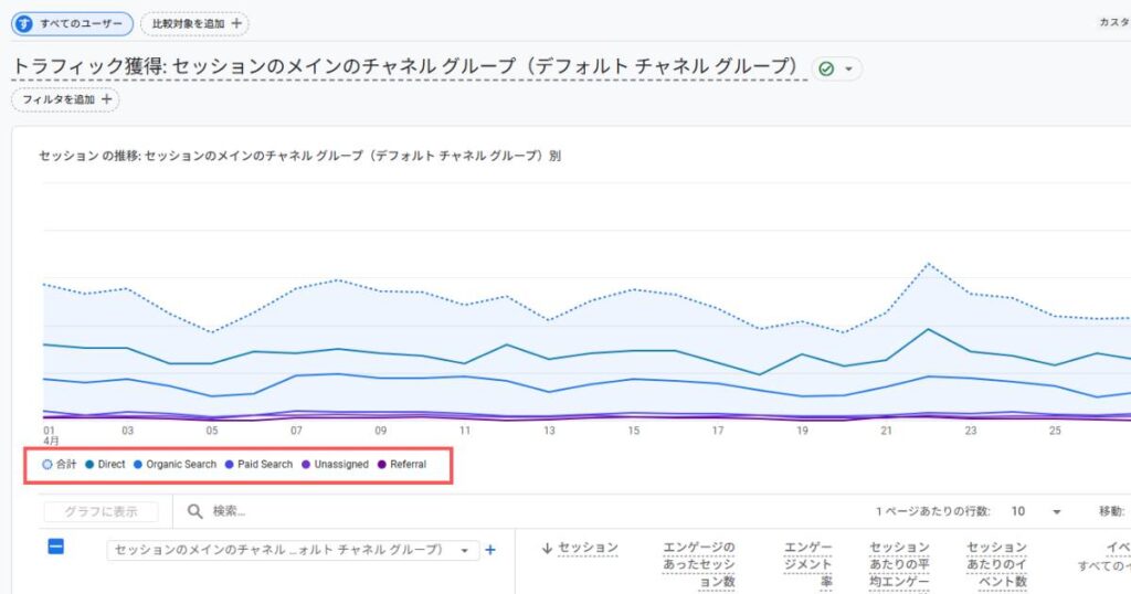 ここでは、チャネルごとにセッション数やユーザー数、エンゲージメントなどを一覧で確認できます。
